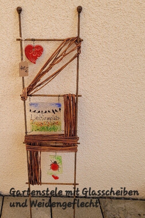 Stele mit Glasscheiben, Weidengeflecht und Keramikherz